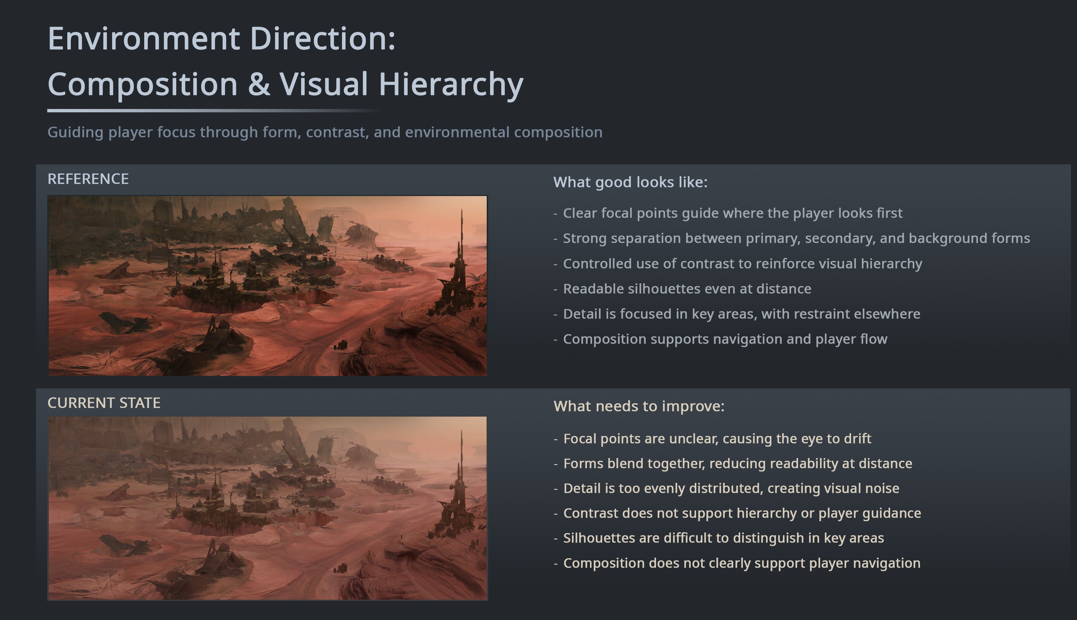 Once the problem is understood, the next step is defining the visual pillars of the project. These pillars help establish tone, visual hierarchy, faction identity, and environmental direction. The goal is to create a shared understanding of the project’s visual language that can guide every discipline involved in production.